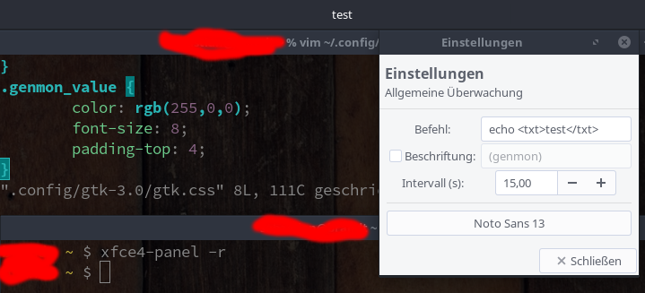 Shows the panel bug, the settings with command 'echo test' and the gtk.css with
