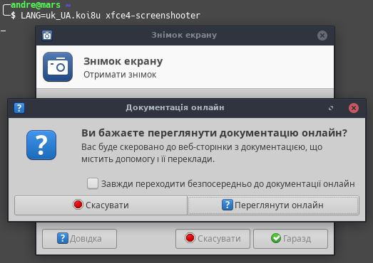 https://bugzilla.xfce.org/show_bug.cgi?id=15349 --- Comment #5 from Andre Miranda <andreldm at xfce.org> --- Created attachment 8519 --> https://bugzilla.xfce.org/attachment.cgi?id=8519&action=edit Screenshooter in Ukranian(KOI) -- You are receiving this mail because: You are the assignee for the bug.