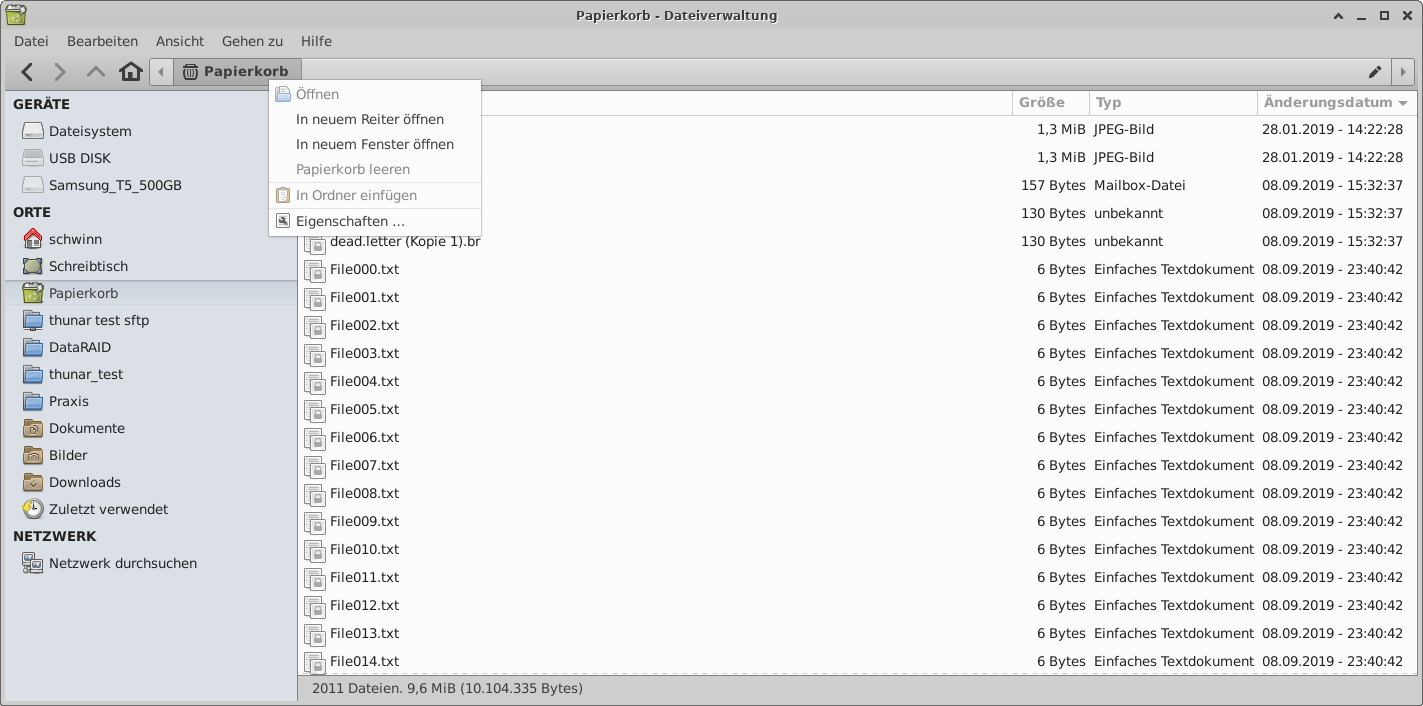 > A context menu isn't available at the trash icon in the navigation bar of Thunar.