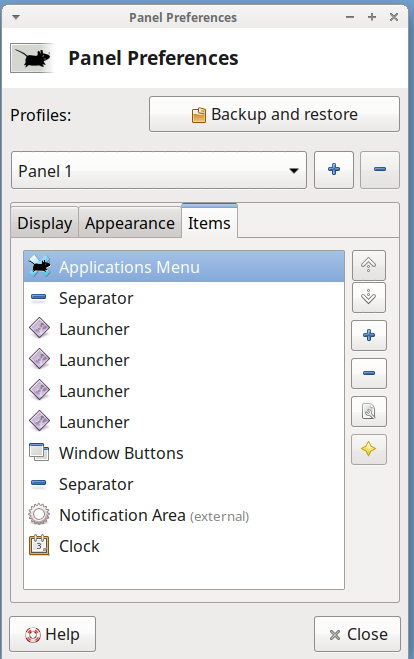 Panel Items tab settings