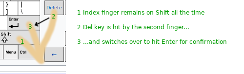 Shift+Del to Shift+Enter to confirm the deletion without having to lift the